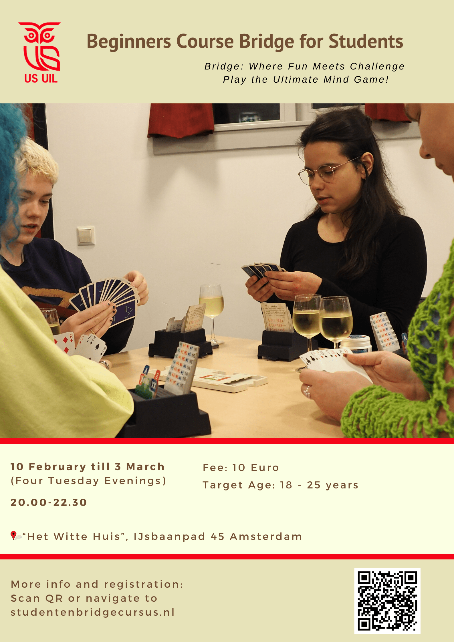 Usil is in samenwerking met andere bridge studenten verenigingen bezig met het opzetten van een online cursus studenten bridge. Deze cursus start op 25 november. Mocht je nog zonen of dochters, of neefjes of nichtjes of andere mensen weten die hieraan willen meedoen, dan kunnen ze zich aanmelden op de website studentenbridge.nl