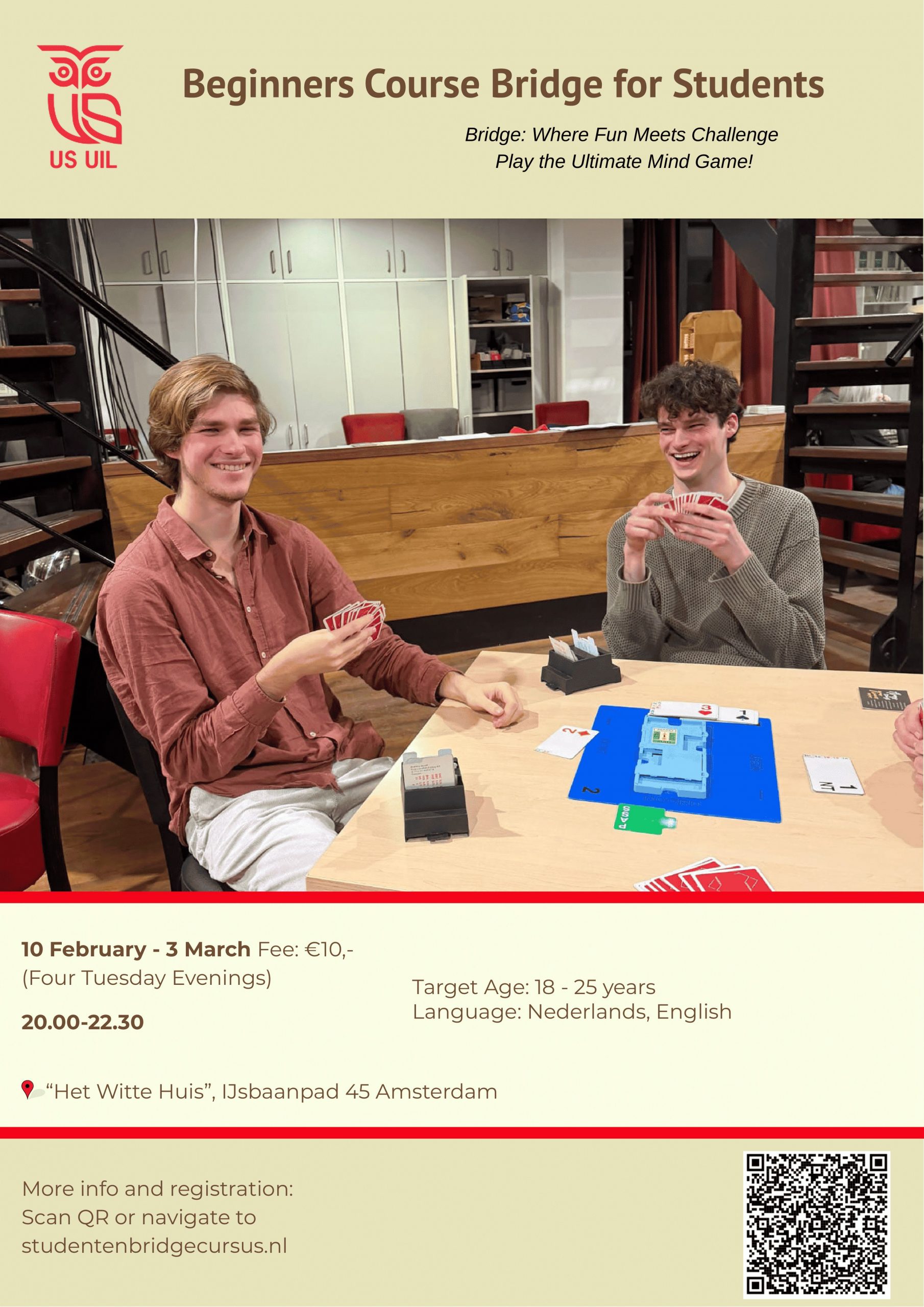 3 februari zijn we van plan om weer een nieuwe cursus te gaan geven. Dus als je nog mensen weet kunnen ze zich https://studentenbridge.nl/index.php?id=bridge-leren hier aanmelden. We zijn ook van plan om een Engelstalige cursus te gaan geven dus je hoeft niet perse Nederlands te spreken.